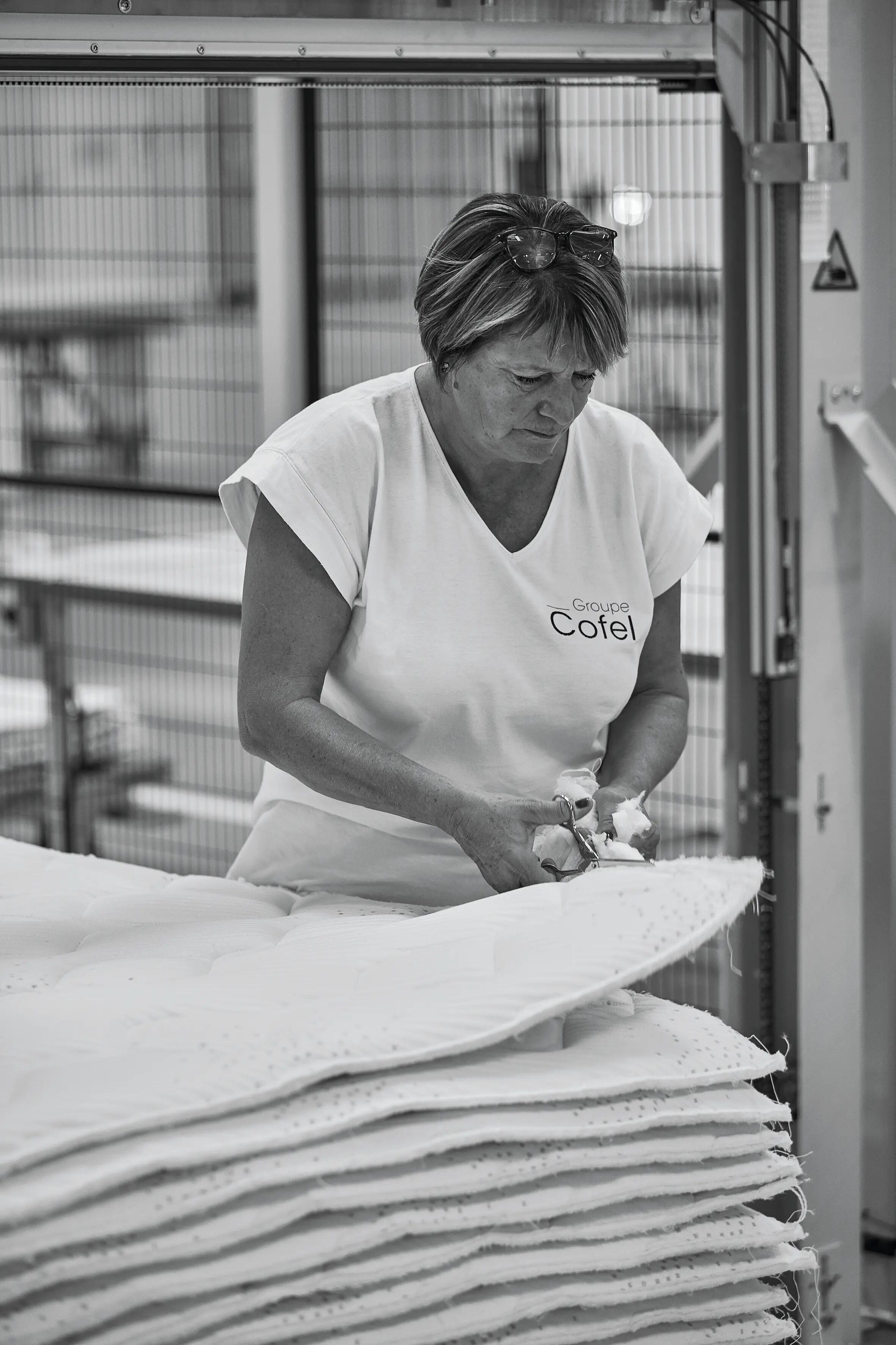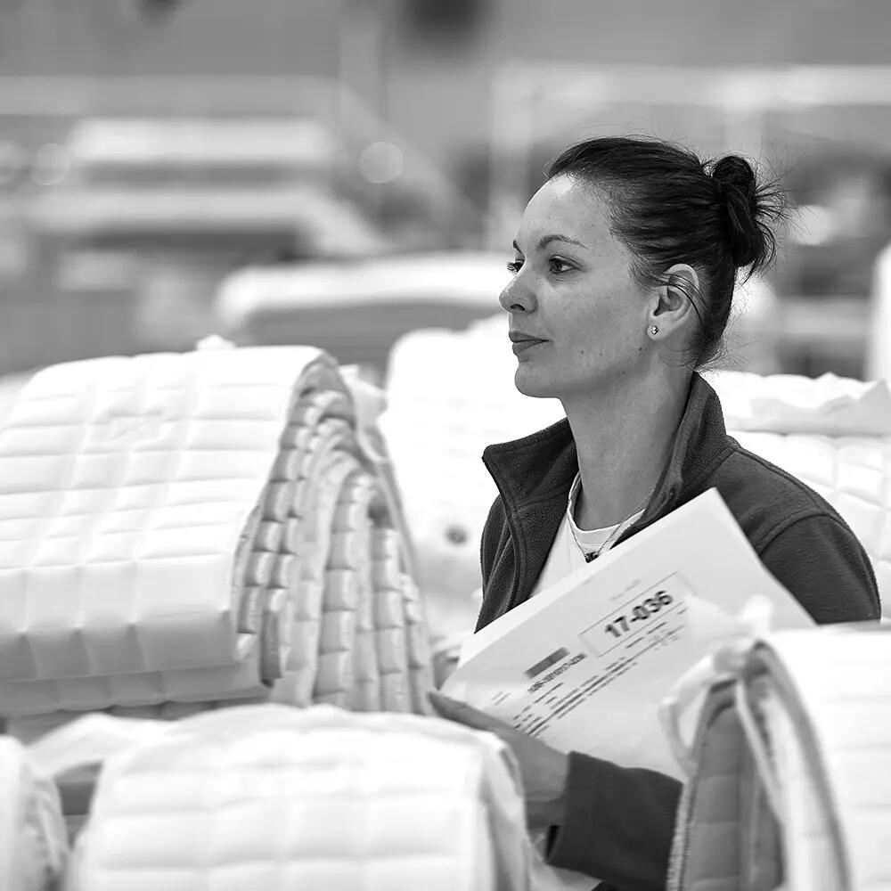 Isabelle, opératrice piquage plateau depuis plus de 20 ans, utilise sa multi-aiguilles pour confectionner et contrôler les faces des matelas. Rapide et experte, elle veille à chaque détail tout en partageant son savoir avec le sourire.